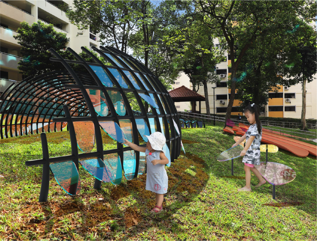 My team’s goal was to connect children with the intangible form of nature – light. By utilizing the play of reflection, shadow and colors, we magnified the interaction with light, creating a sense of magical wonder when children enter the playscape.