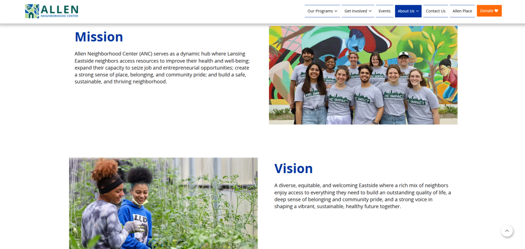 Allen Neighborhood Center (ANC) is a non-profit organization that serves as a dynamic hub where Lansing Eastside neighbors access resources to improve their wellbeing, job opportunities, and create a strong sense of belonging to build a safe, sustainable, and thriving neighborhood.